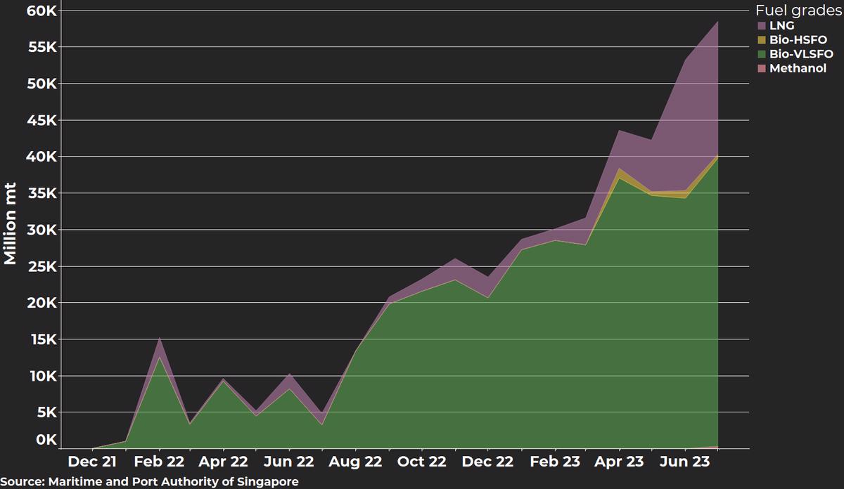 Almost all of the 40,000 mt of bio-blended bunkers sold was VLSFO blended with a bio component – typically 24% biofuel in Singapore.