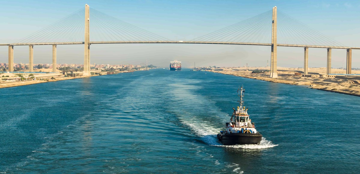 PHOTO: Tug boat ahead of container ship transiting the Suez Canal, Egypt. Getty Images