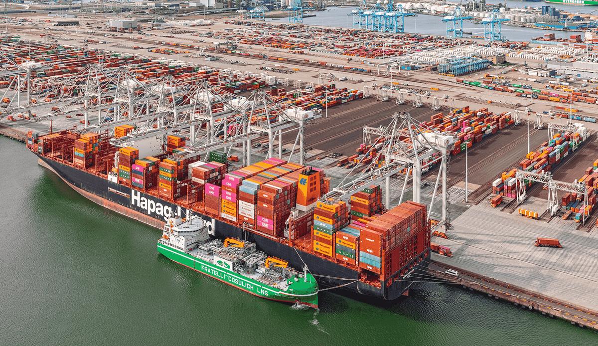 PHOTO: Hapag Lloyd's containership, Brussels Express, bunkered with 2,200 mt of mass-balanced liquid biomethane in Rotterdam. Titan Clean Fuels