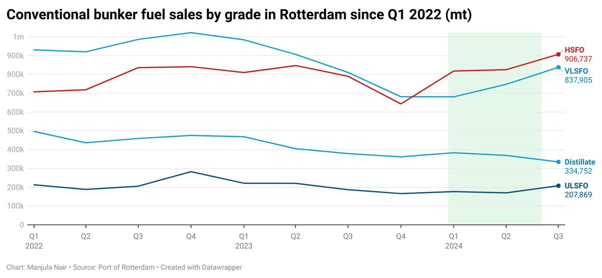 Higher HSFO sales contributed to lift Rotterdam's total conventional bunker fuel sales by 8% in Q3 2024, according to bunker sales figures released by the Port of Rotterdam Authority.
