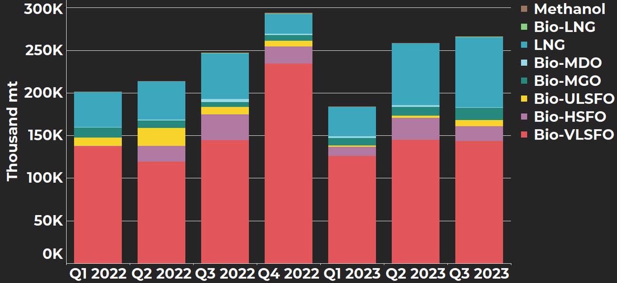 Total biofuel sales fell from 186,000 mt in the second quarter of this year, to 183,000 mt in the third quarter. About 78% of biofuel blends sold in the third quarter were bio-VLSFO, followed by bio-HSFO (9%) and bio-MGO (8%).