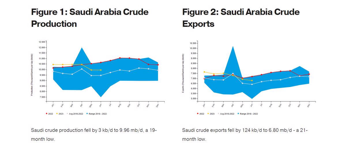 Saudi Arabia’s crude oil exports totalled 6.80 million b/d in June, down 124,000 b/d from the previous month, latest data from the JODI showed. This drop in exports came one month before the country decided to extend its voluntary production cuts of 1 million b/d in July.