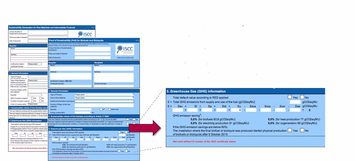 PHOTO: ISCC templates for a Sustainability Declaration (left) and a Proof of Sustainability (PoS, right). ISCC