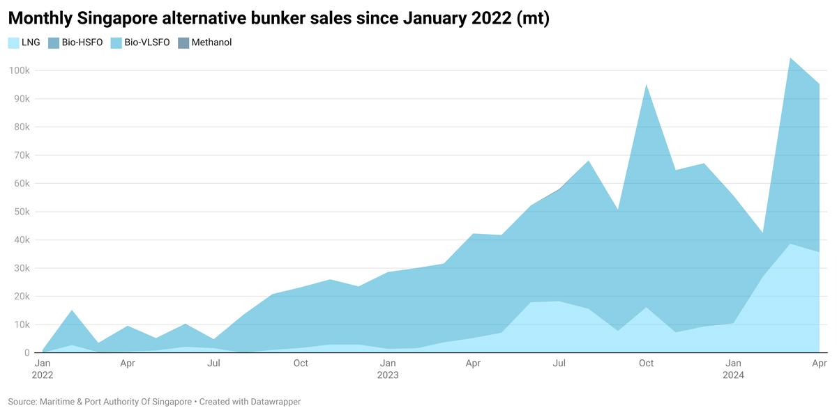 All of the 60,000 bio-blended bunkers sold in April were VLSFO blended with a bio component—typically 24% in Singapore. Total biofuel bunker sales across the first four months of this year stood at 187,000 mt, significantly higher than around 123,000 mt sold in the same period last year.