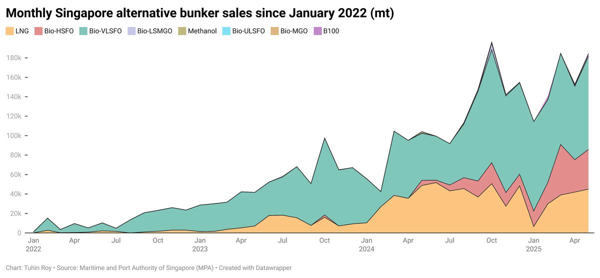 For the January–May period, total biofuel bunker sales reached 610,000 mt - nearly three times higher than the 241,000 mt recorded during the same period last year.