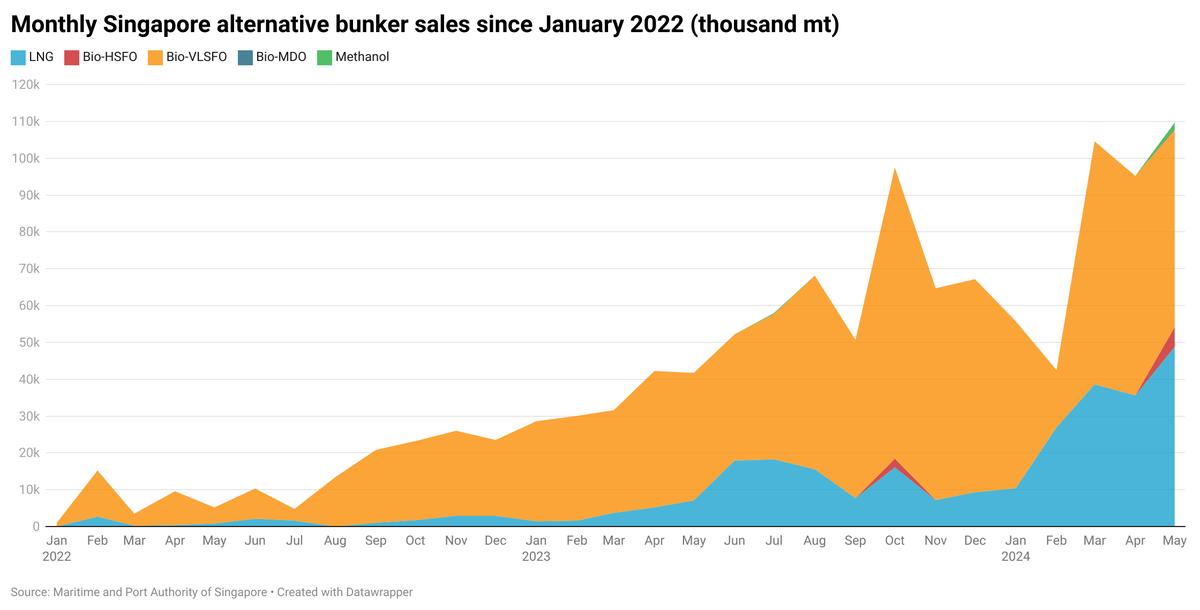 Most of the 54,000 bio-blended bunkers sold in May were VLSFO blended with a bio component—typically 24% in Singapore. Total biofuel bunker sales across the first five months of this year stood at 241,000 mt, significantly higher than around 159,000 mt sold in the same period last year.