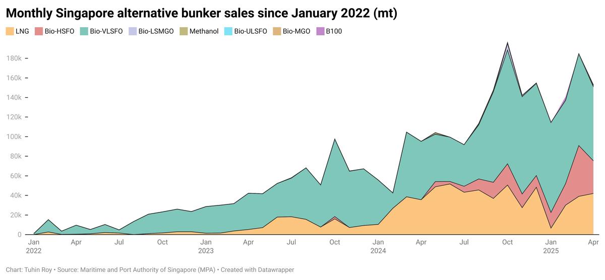 Of this, approximately 76,000 mt was VLSFO blended with a bio component—typically 24% in Singapore—while 33,000 mt was HSFO with a bio blend. Bio-blended LSMGO and ULSFO accounted for the remainder, at 1,200 mt and 700 mt, respectively.