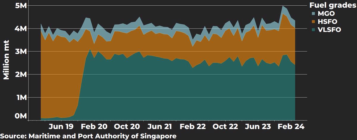 Less VLSFO sales contributed to drag the port’s total bunker sales 3% lower in March than across February.