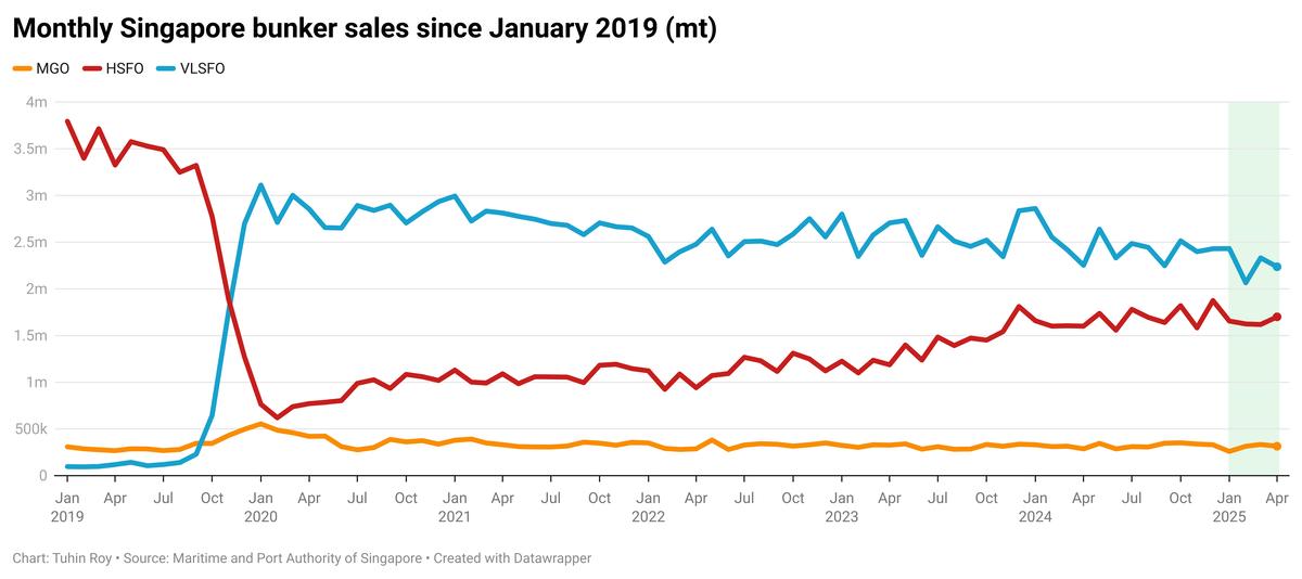 Preliminary data from the Maritime and Port Authority of Singapore shows that MGO and VLSFO sales in April declined by 6% and 4%, respectively.