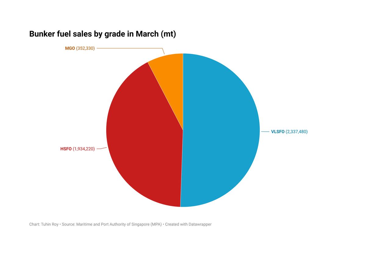 In March, HSFO sales in the Port of Singapore rose by 5%, while VLSFO sales edged up by 1%. In contrast, MGO sales declined by 6% over the same period.