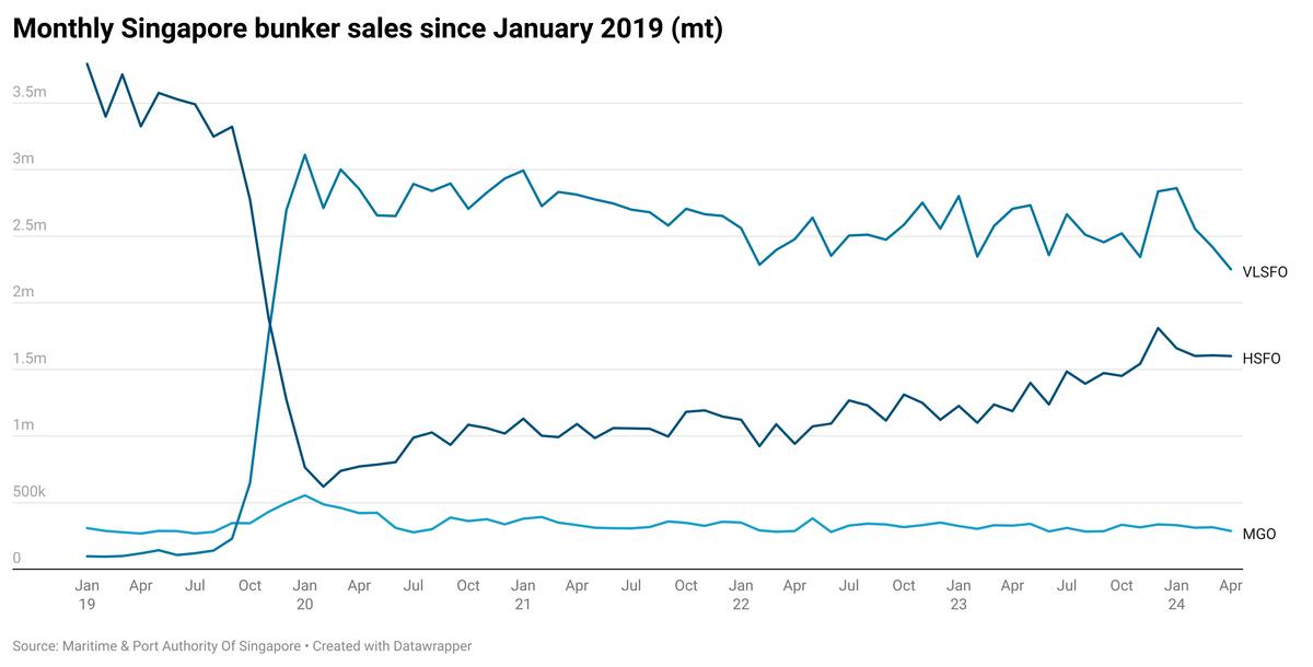 - HSFO sales down 5,000 mt to 1.60 million mt