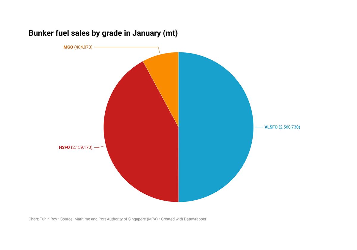 Singapore’s VLSFO sales declined 10% month-on-month, while total MGO sales edged down by 2%. In contrast, HSFO sales increased by 2% compared to December levels, according to preliminary data from the Maritime and Port Authority of Singapore.