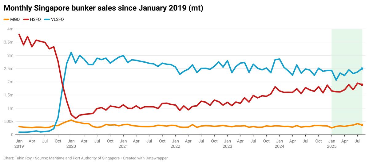 Sales of MGO and HSFO in August fell by 12% and 3%, respectively. In contrast, VLSFO sales rose by 5% during the month, according to preliminary data from the Maritime and Port Authority of Singapore.
