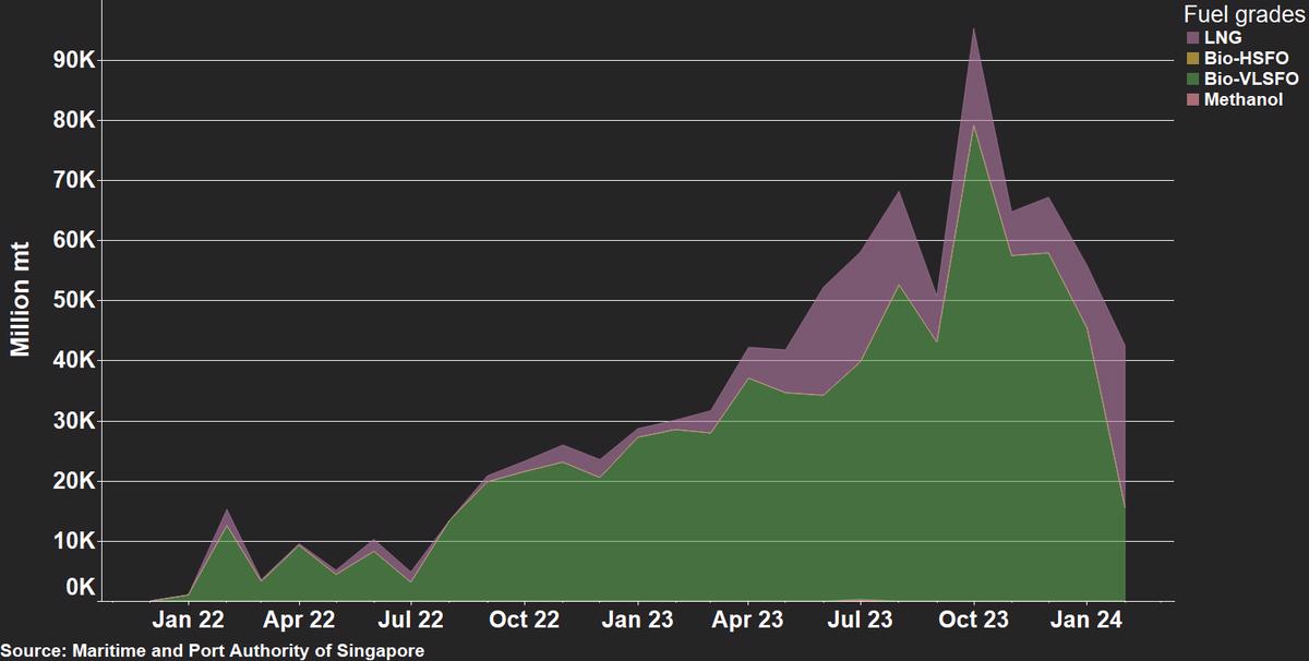 All of the 16,000 bio-blended bunkers sold in February were VLSFO blended with a bio component – typically 24% in Singapore. Total biofuel bunker sales across the first two months of this year stood at 70,000 mt, significantly higher than around 57,000 mt sold in the same period last year.