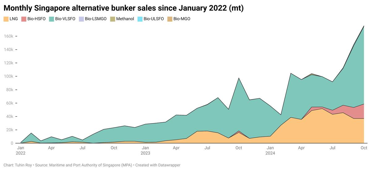 In October, Singapore's bio-blended bunker sales rose sharply by 26%, reaching nearly 139,000 mt and surpassing the previous record high of 111,000 mt in September.