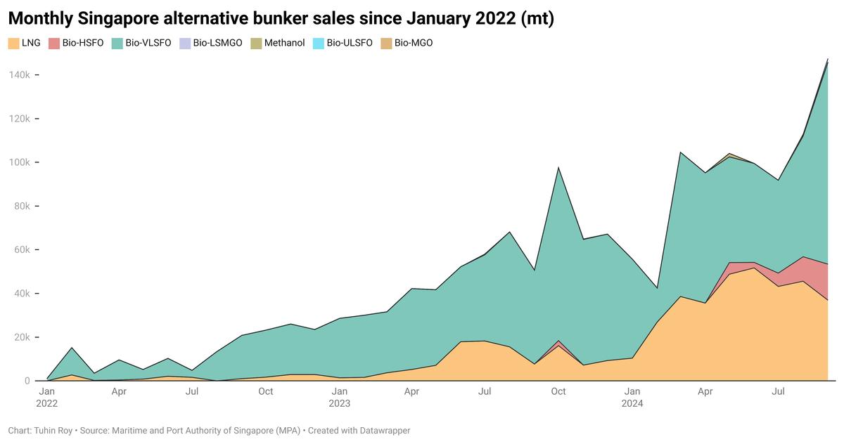 Singapore's total bio-blended bunker sales surged by 63% in September, reaching 111,000 mt, surpassing the previous highest monthly sales record of 79,000 mt in October last year.