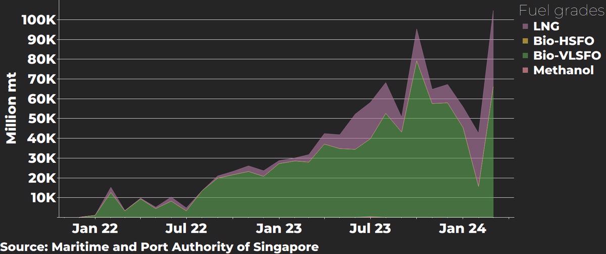 Singapore's bio-blended bunker sales increased by more than 300% in March, reaching their highest level since October last year.