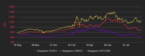 Singapore VLSFO and HSFO prices up on the day, LSMGO falls