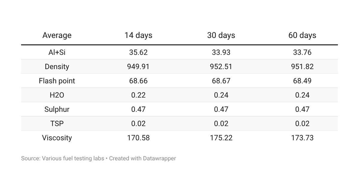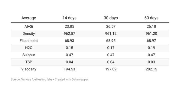 Typical VLSFO qualities in Singapore based on 365 fuel samples over the past 14 days.