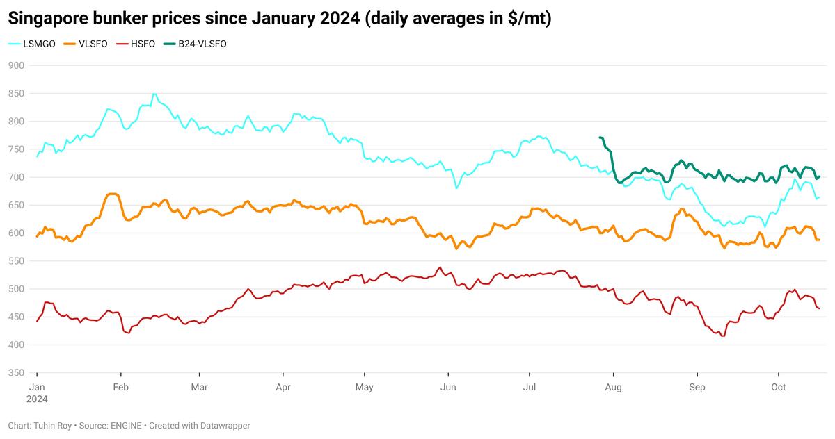 Singapore’s B24-VLSFO and LSMGO prices rise, VLSFO and HSFO dip