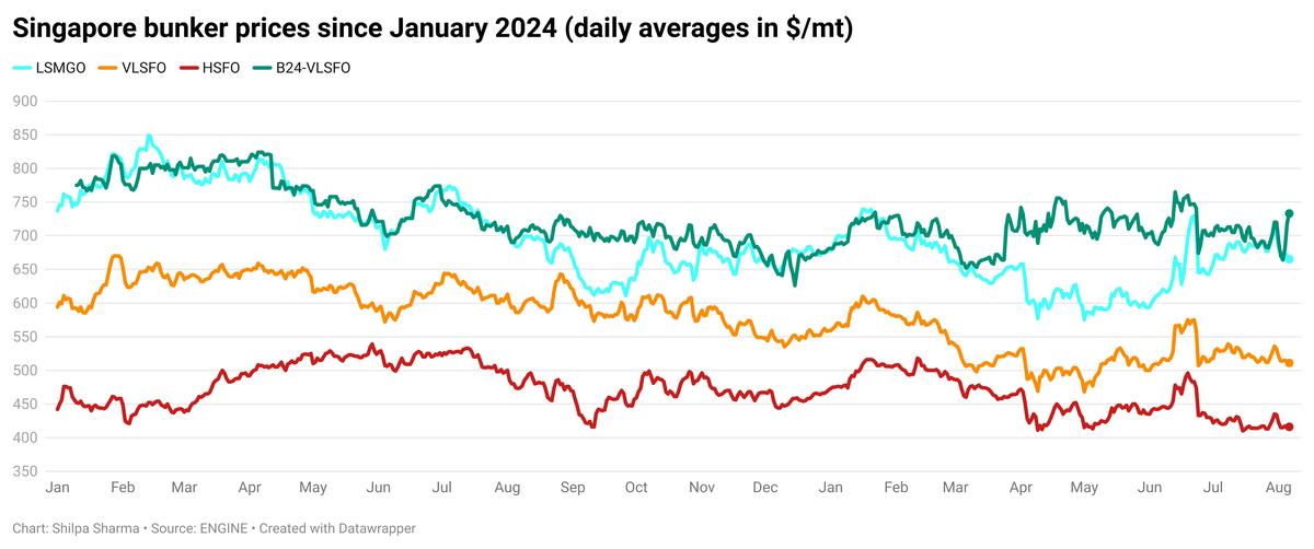 Singapore’s B24-VLSFO price surges, VLSFO, LSMGO and HSFO dip