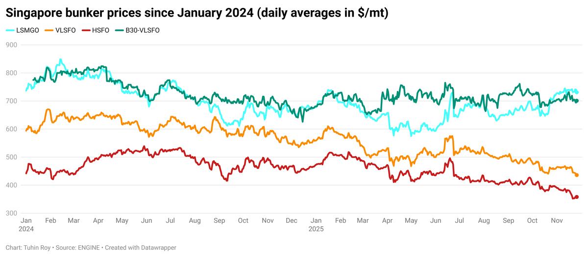 Singapore’s B30-VLSFO price inches up, VLSFO, LSMGO and HSFO decline