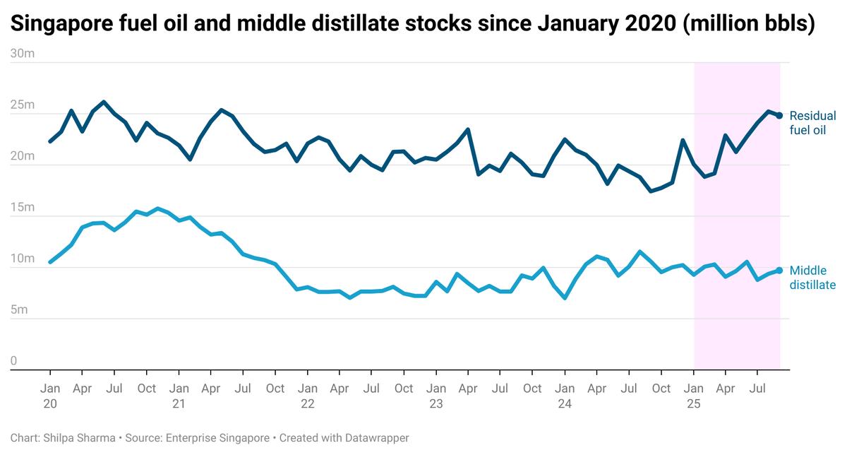 Singapore’s fuel oil inventories remained above 24 million bbls in September, despite a 13% fall in the port's net fuel oil imports.