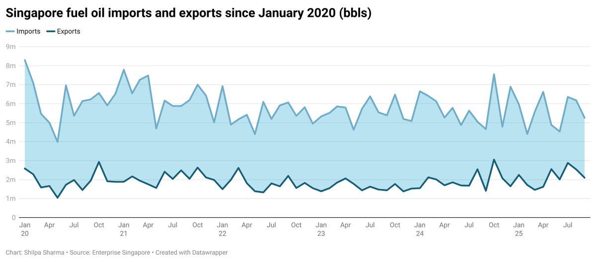 Singapore’s residual fuel oil stocks averaged 2% lower in September than across August, according to Enterprise Singapore.