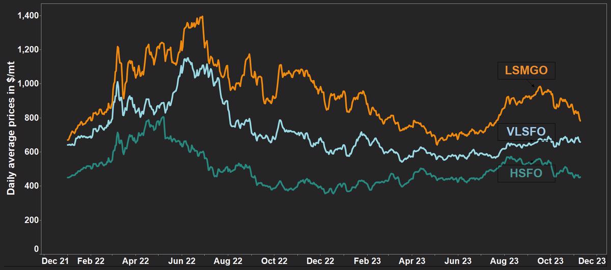 Singapore’s HSFO price rises, VLSFO and LSMGO decline