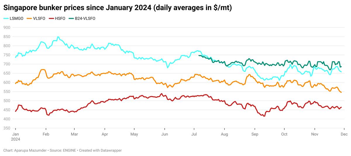 Singapore’s HSFO price rises, VLSFO, B24-VLSFO and LSMGO decline