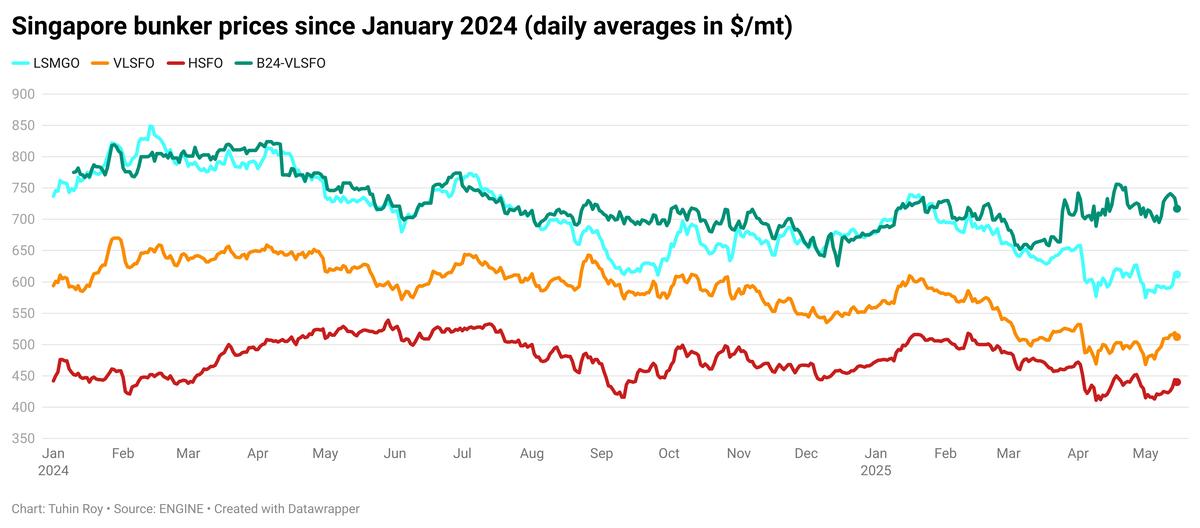 Singapore’s LSMGO price inches up, VLSFO, B24-VLSFO and HSFO fall