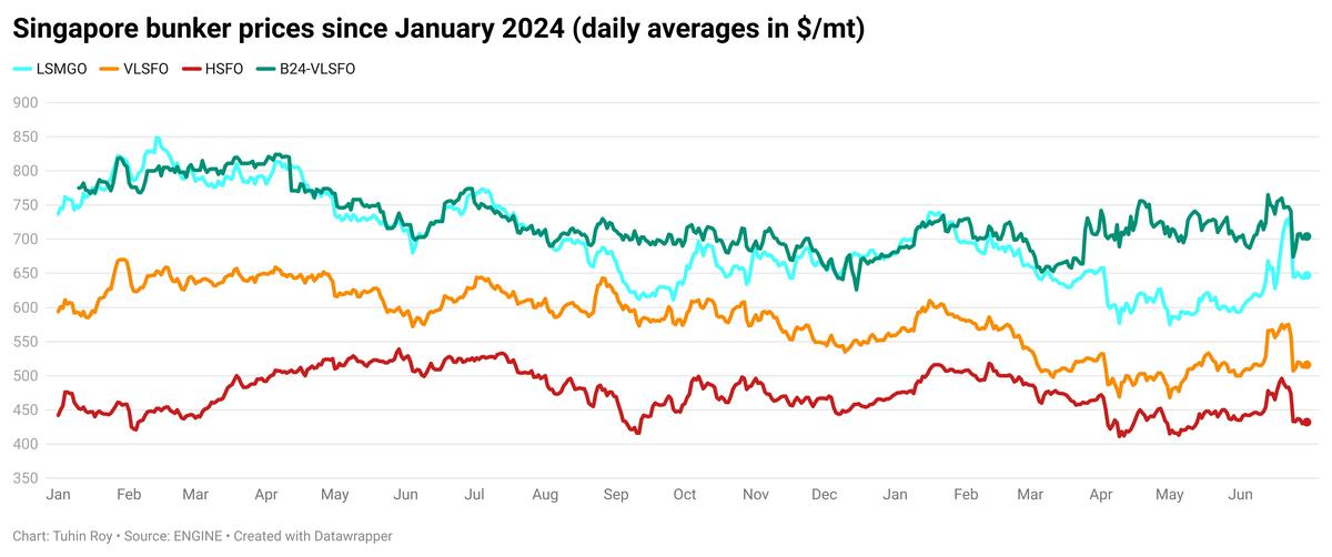 Singapore’s LSMGO price steady over the weekend, VLSFO, B24-VLSFO and HSFO down