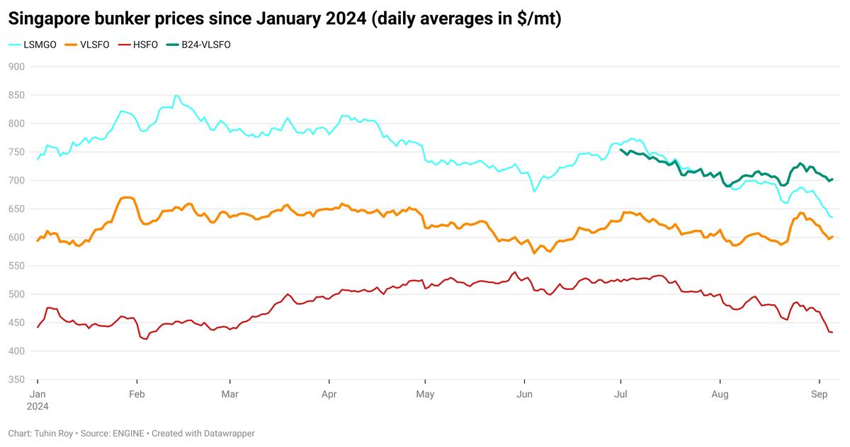 Singapore’s VLSFO and B24-VLSFO prices rise, LSMGO and HSFO dip