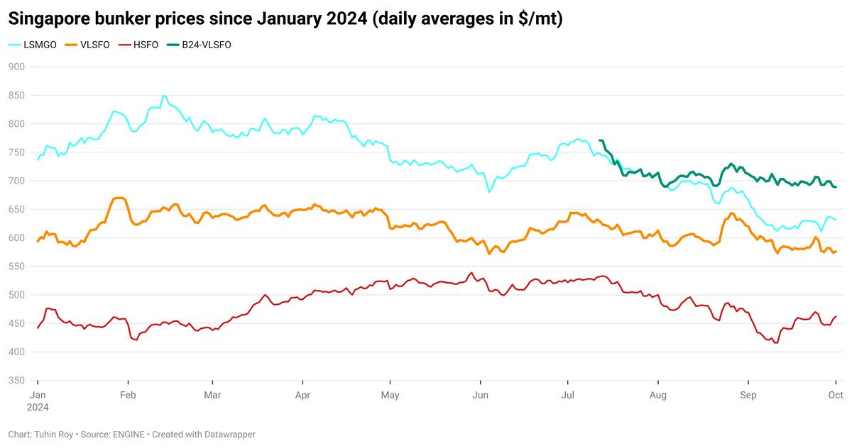 Singapore’s VLSFO and HSFO prices rise, B25-VLSFO and LSMGO fall