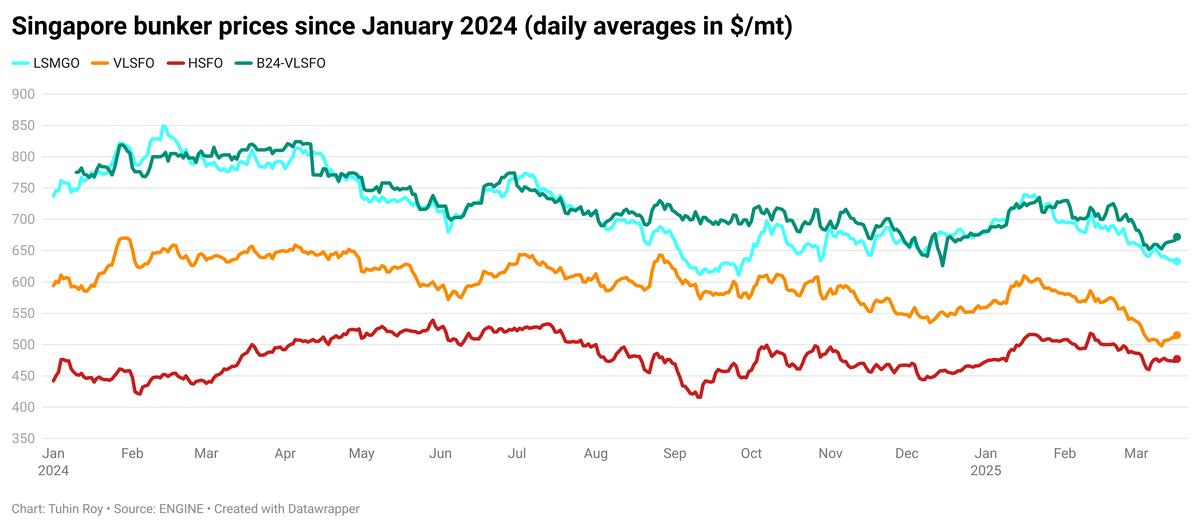 Singapore’s VLSFO, B24-VLSFO and HSFO prices rise over the weekend, LSMGO dips