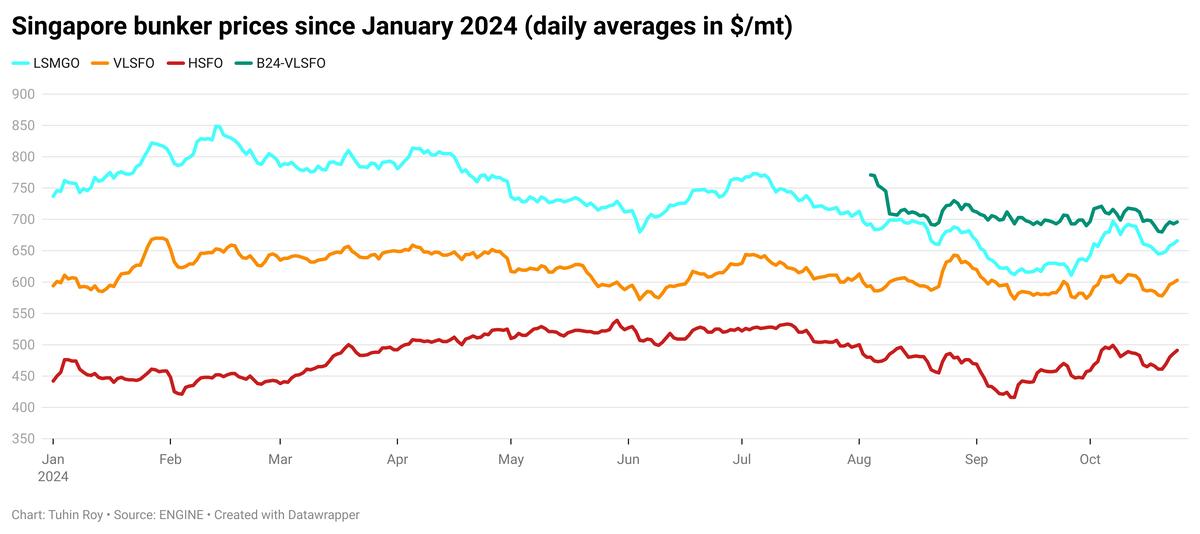 Singapore’s VLSFO, LSMGO and HSFO prices inch up, B24-VLSFO dips