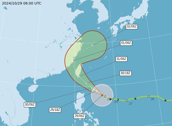 MAP: The projected path of Typhoon Kong-rey as of Tuesday. CWA