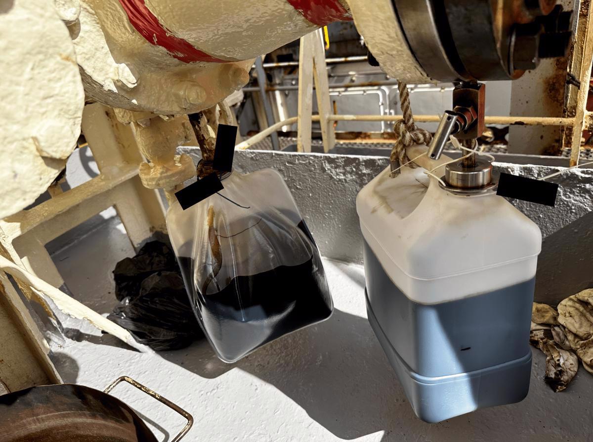 PHOTO: Biofuel sampling conducted by a surveyor during a biofuel bunkering pilot project. GCMD