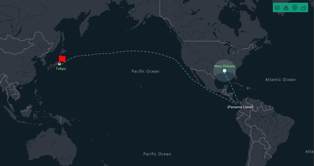 MAP: Shipping route between New Orleans and Tokyo via the Panama Canal. ENGINE