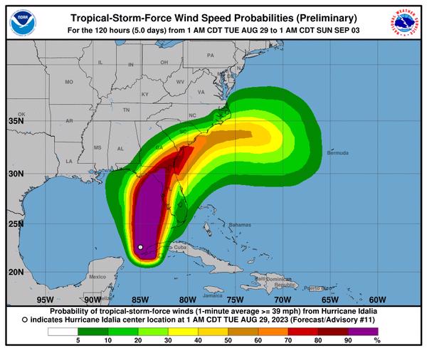 MAP: Projected wind speeds of Tropical Storm Idalia. National Hurricane Center