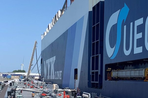 Japan-based NYK-owned and UECC chartered vessel, M/V Emerald Leader, was bunkered with 470 mt of biofuel – a blend of 30% sustainable biofuel and 70% conventional VLSFO – in Vlissingen. This denotes the first biofuel bunkering of a UECC chartered vessel.