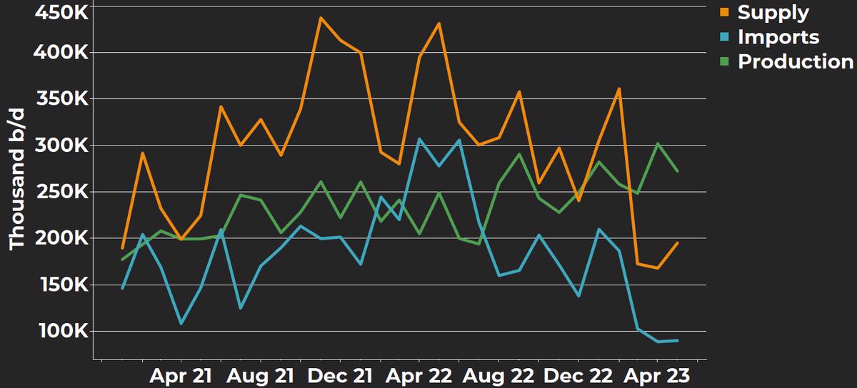 Monthly average US fuel oil supply, imports and production since January 2021
