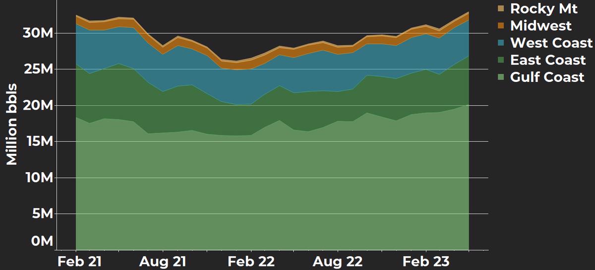 - Gulf Coast stocks up 620,000 bbls to 20 million bbls