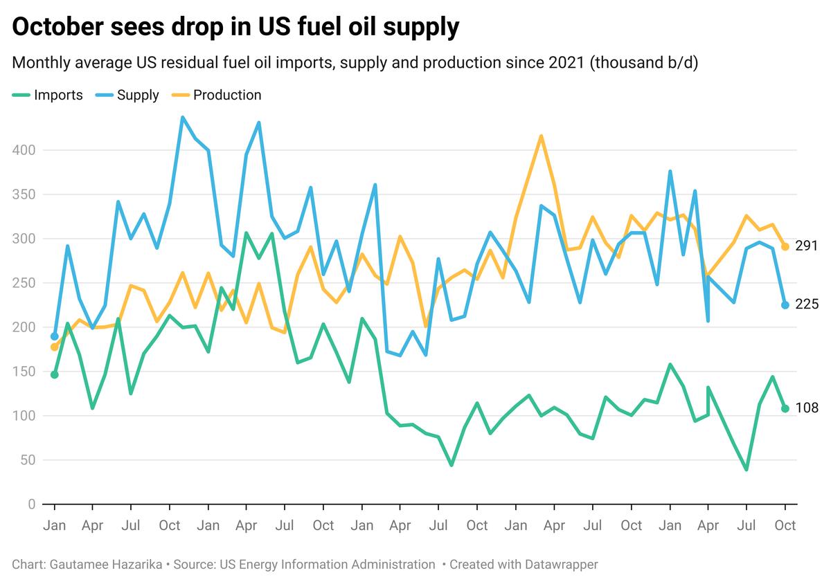 The US produced 8% less fuel oil per day on average in October compared to September, according to the Energy Information Administration (EIA).