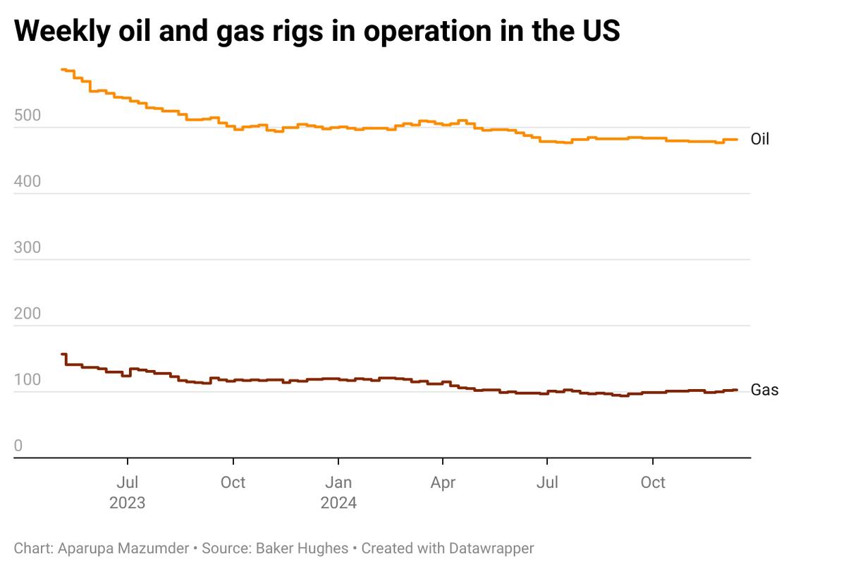 The total number of US oil and gas rigs was down by 34, or 5.4% from a year earlier.