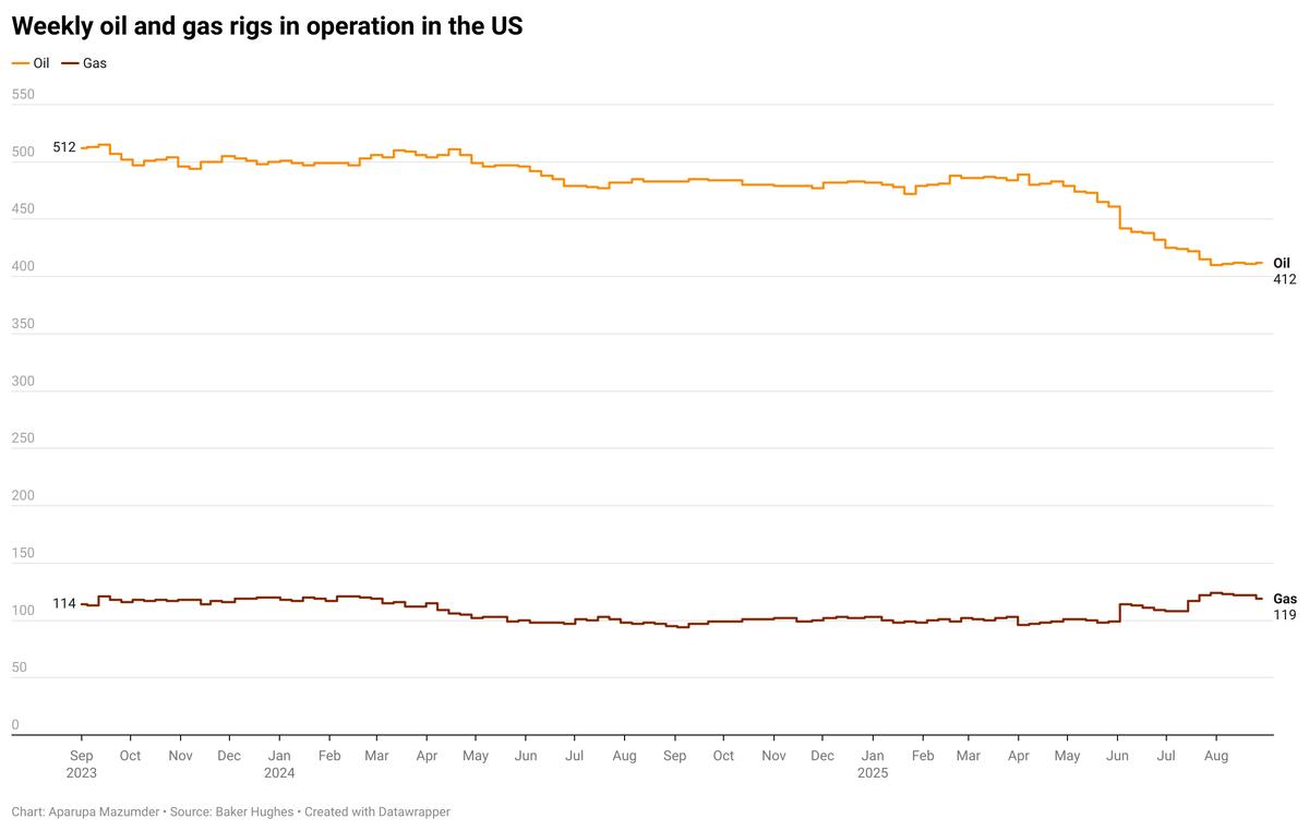 The total number of oil rigs gained by one over the week to 412, while gas rigs fell by three to reach 119.