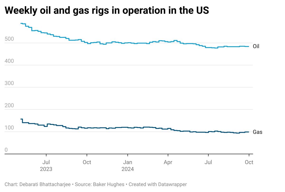 The number of oil rigs fell by four to 484, while gas rigs rose by three to 99.