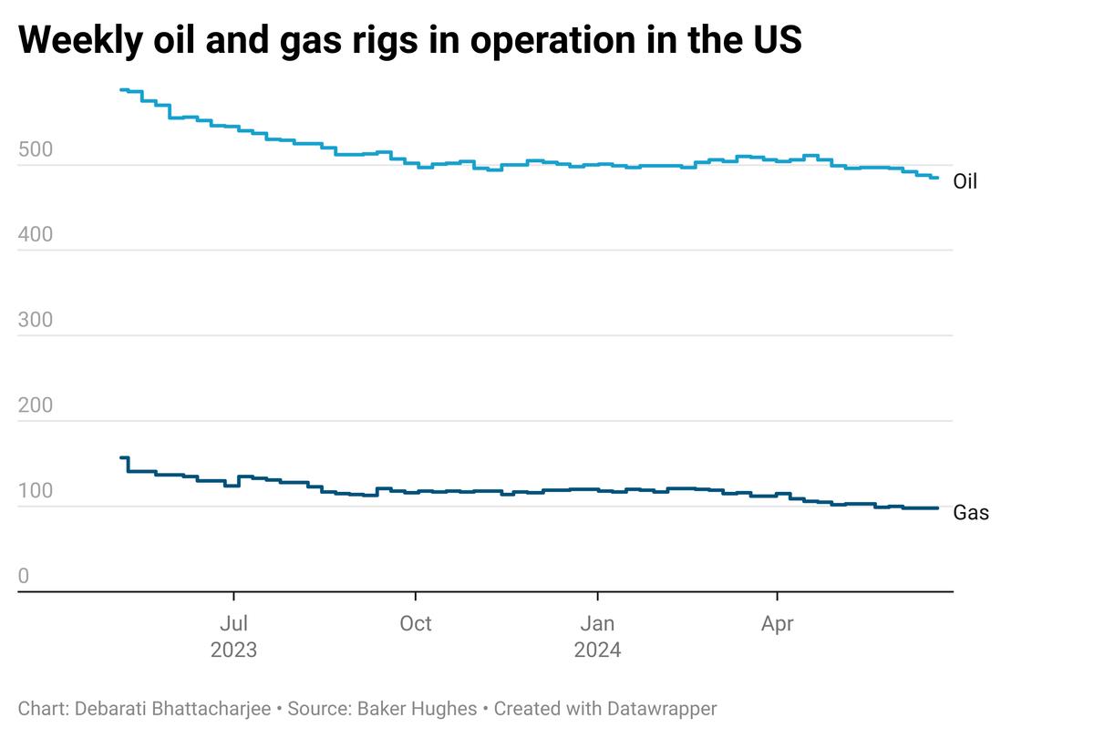 The number of rigs drilling for crude oil and natural gas fell by two to 588 units last week, the lowest since January 2022, according to Baker Hughes.