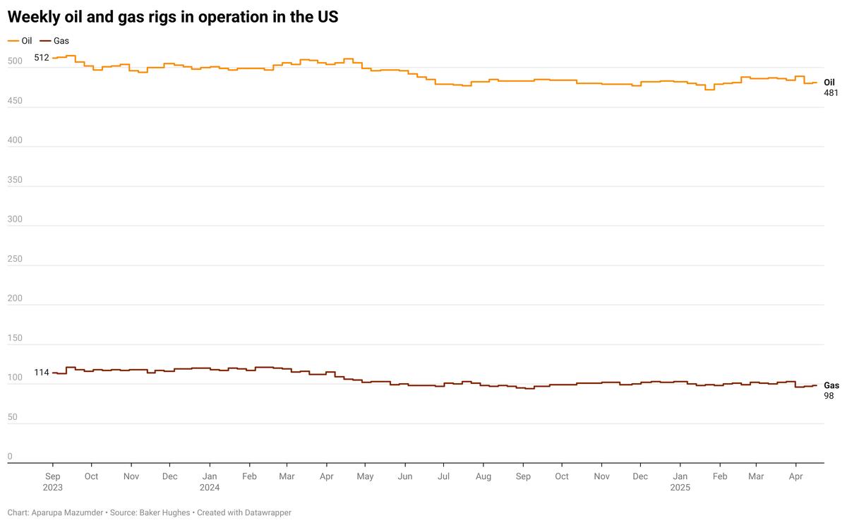 The total number of rigs drilling for crude oil and natural gas in the US gained by two to 585 units last week, according to Baker Hughes.