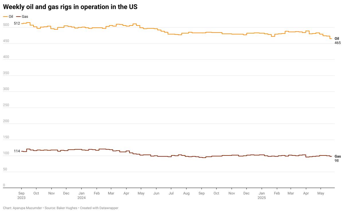 The total number of rigs drilling for crude oil and natural gas in the US declined by ten to 566 units last week, according to Baker Hughes.